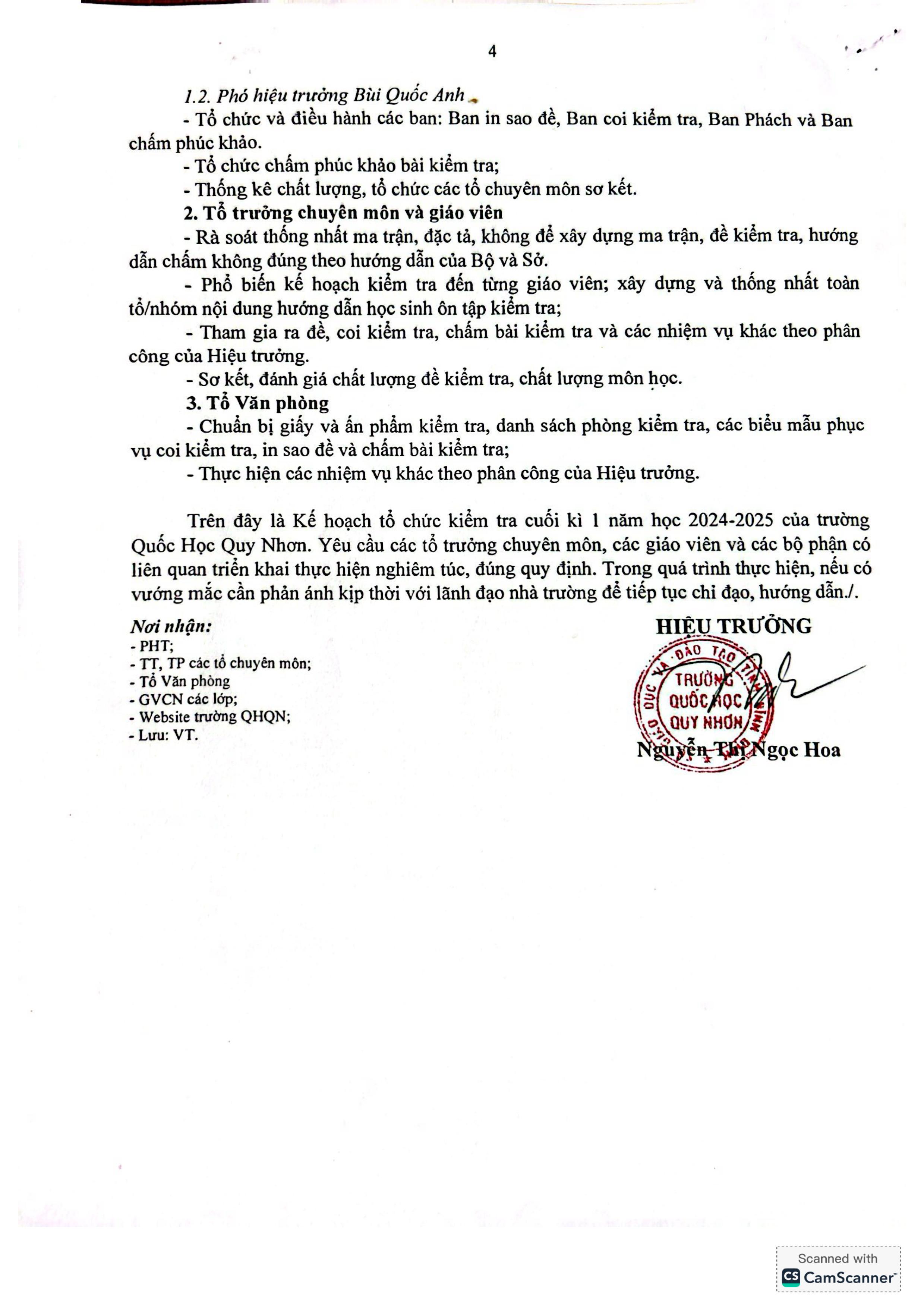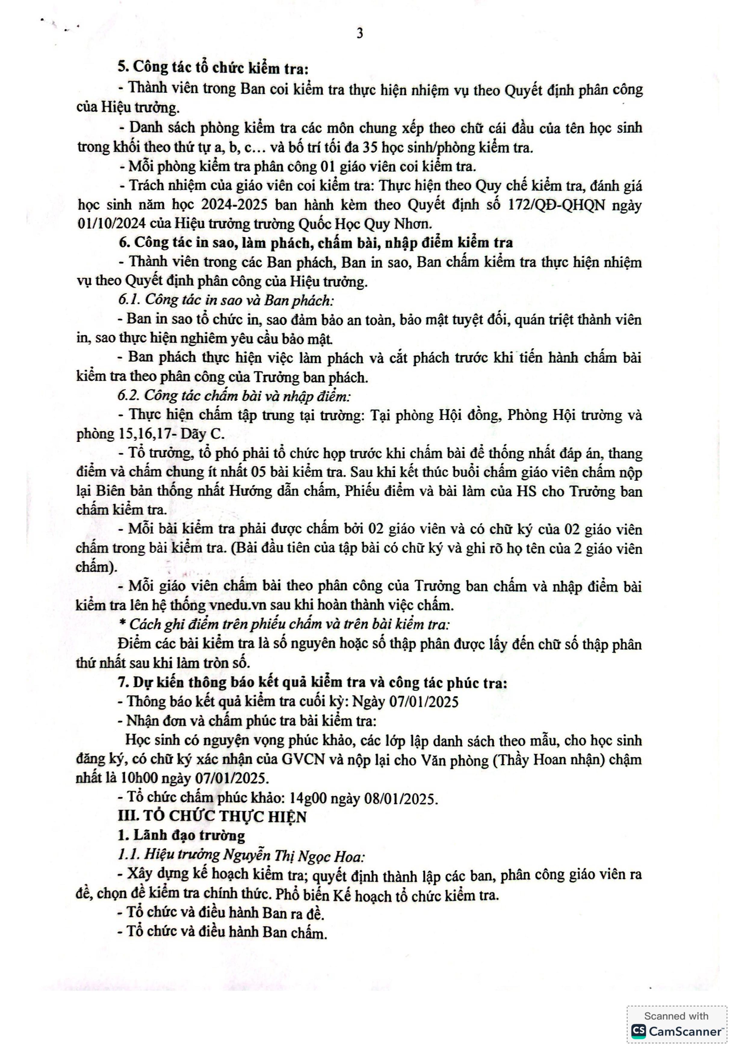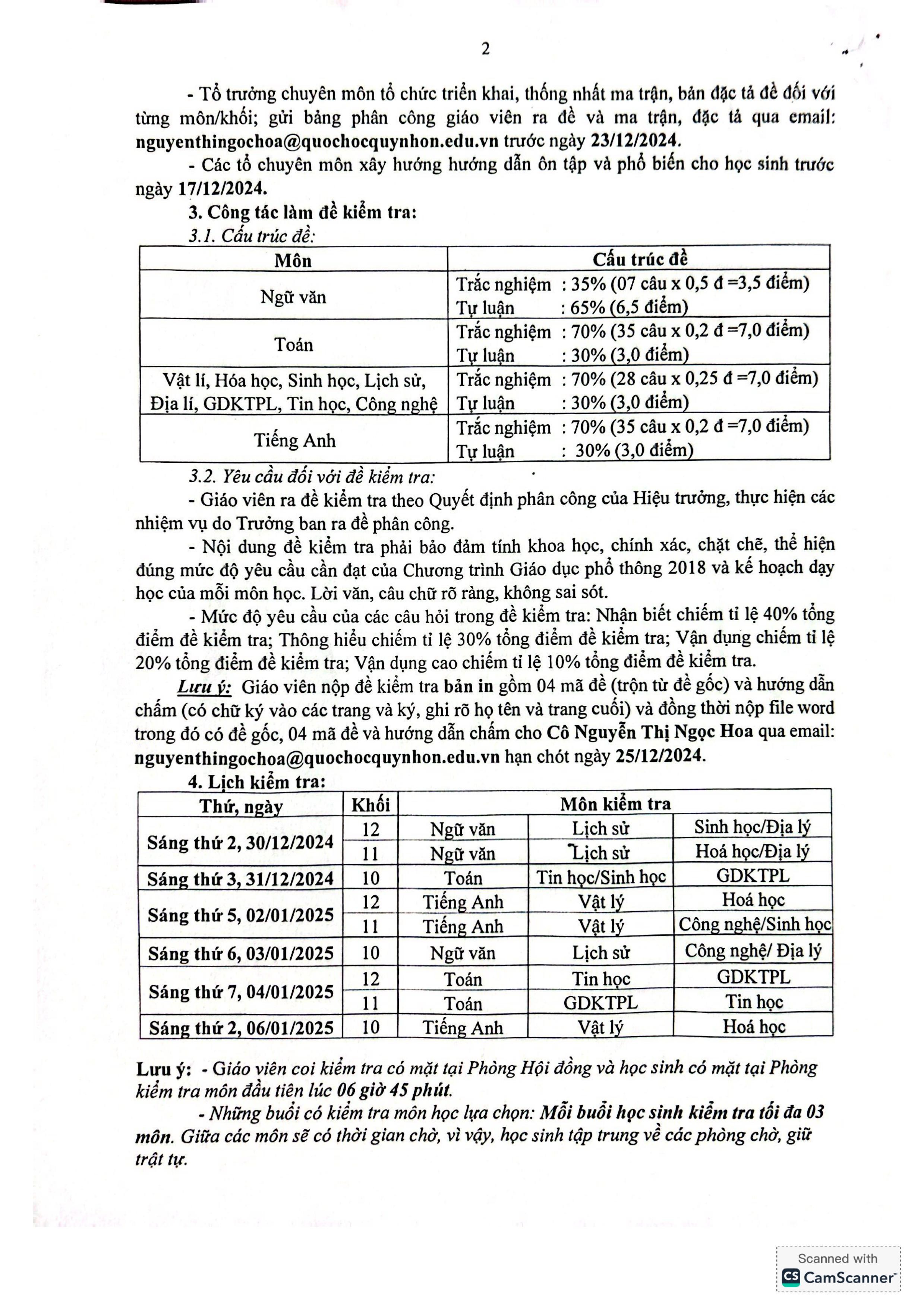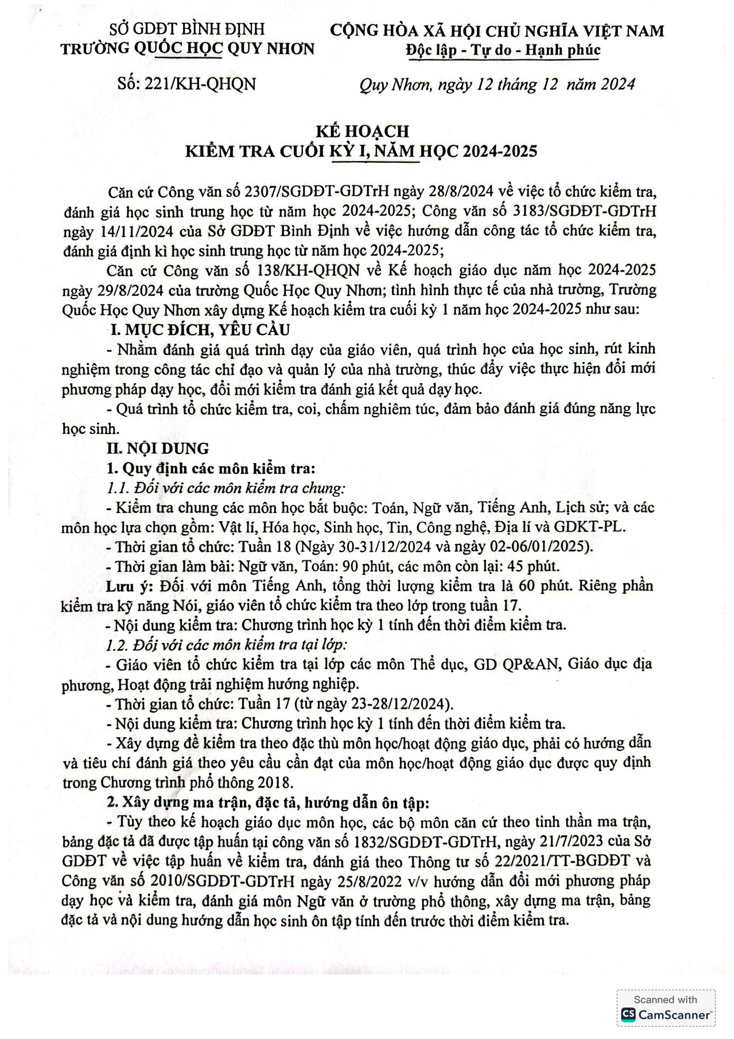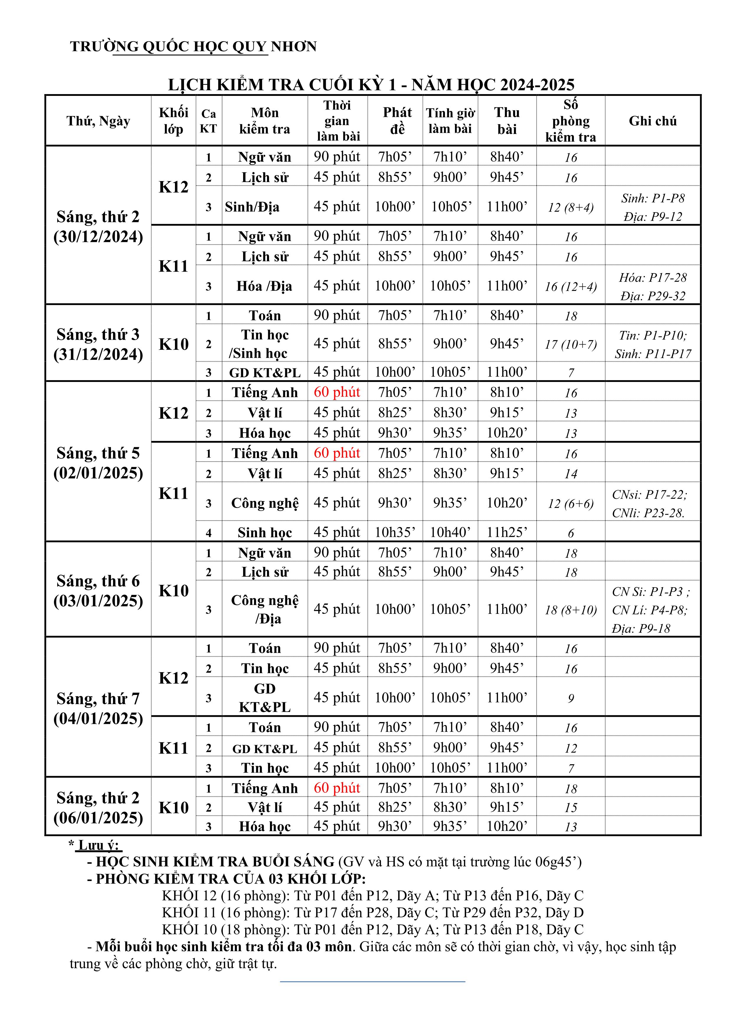 Kế hoạch kiểm tra cuối học kỳ 1, năm học 2024- 2025